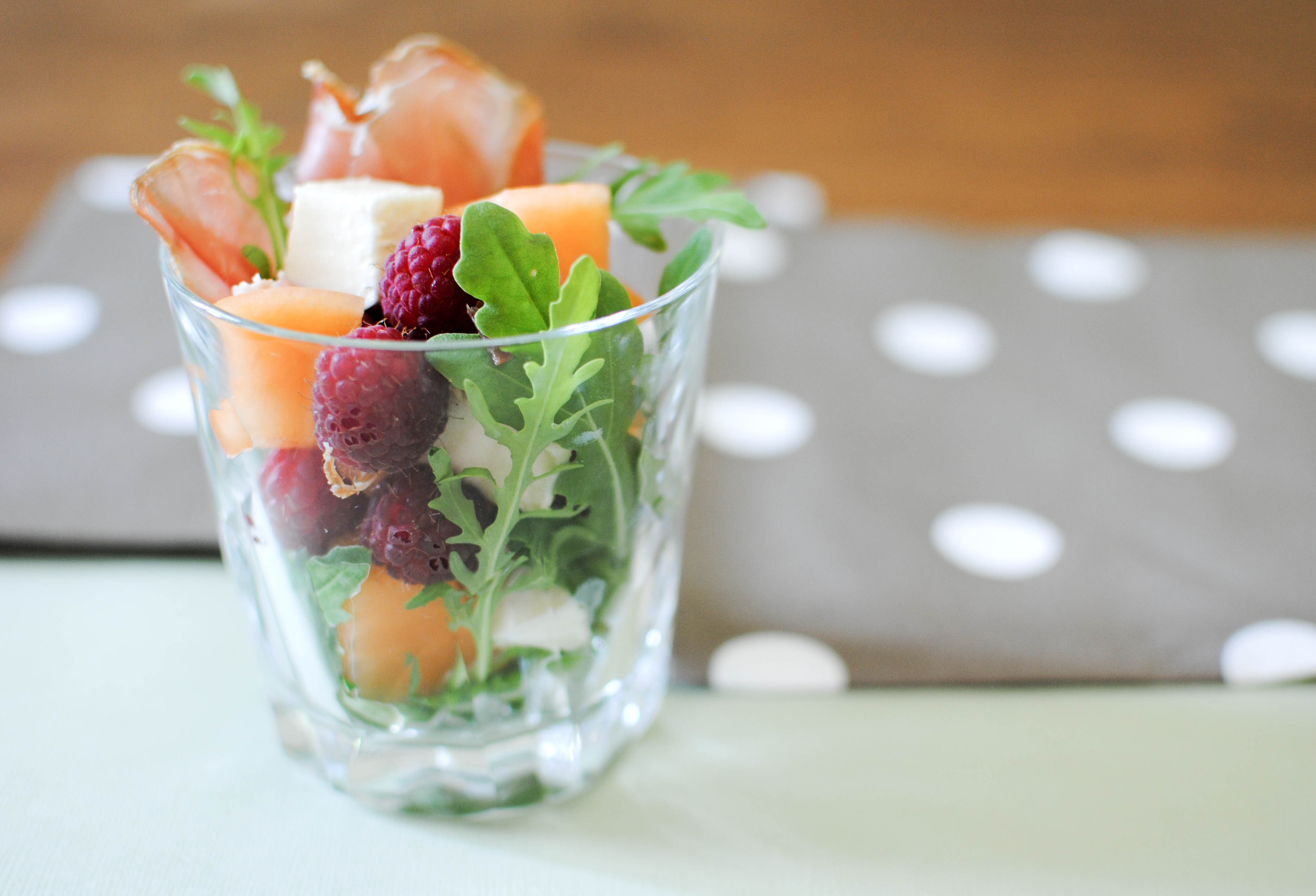 Disposez dans des verrines, un peu de roquette, du melon, de la mozzarella et des framboises. Puis ajoutez le jambon cru et arrosez avec la marinade du melon.