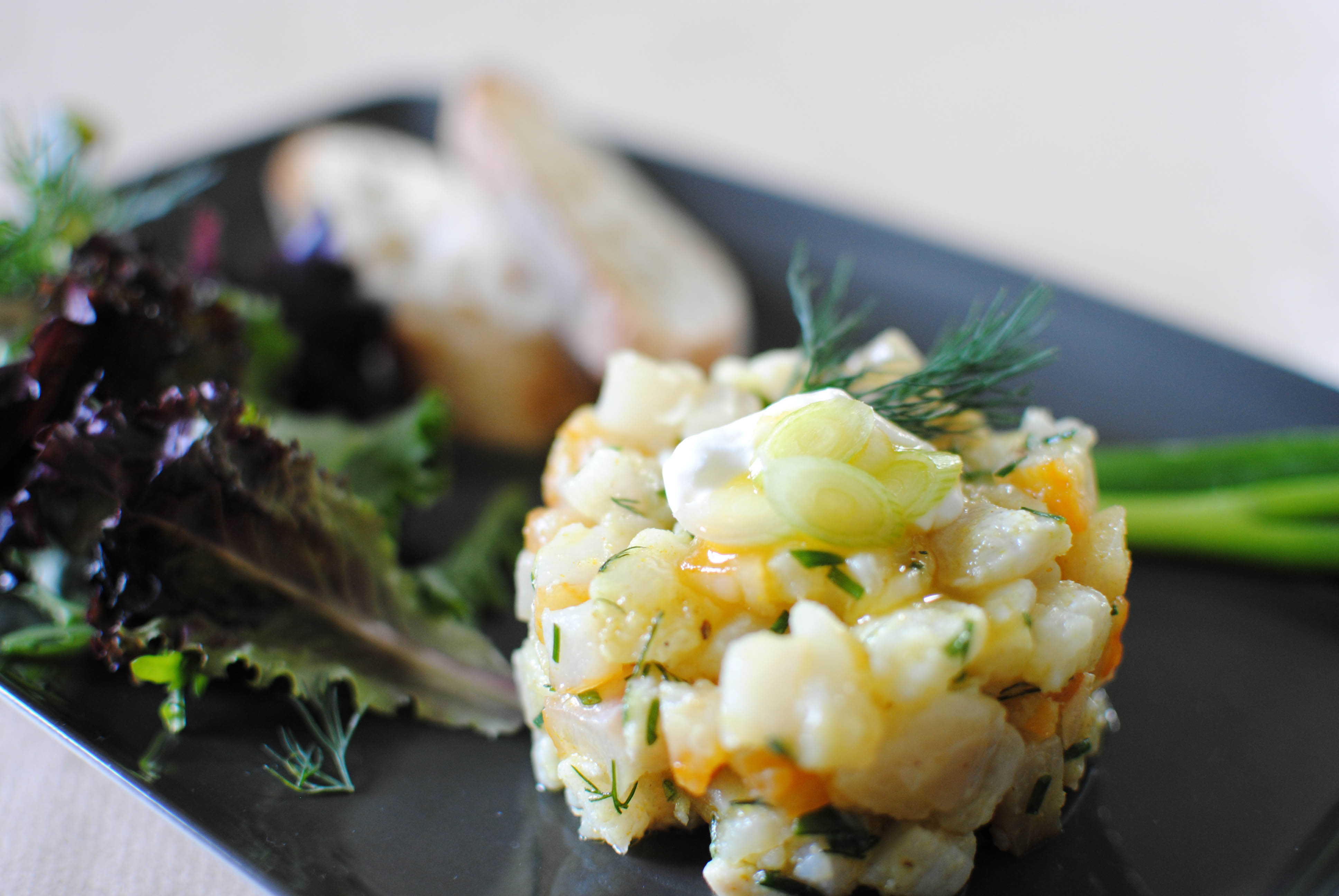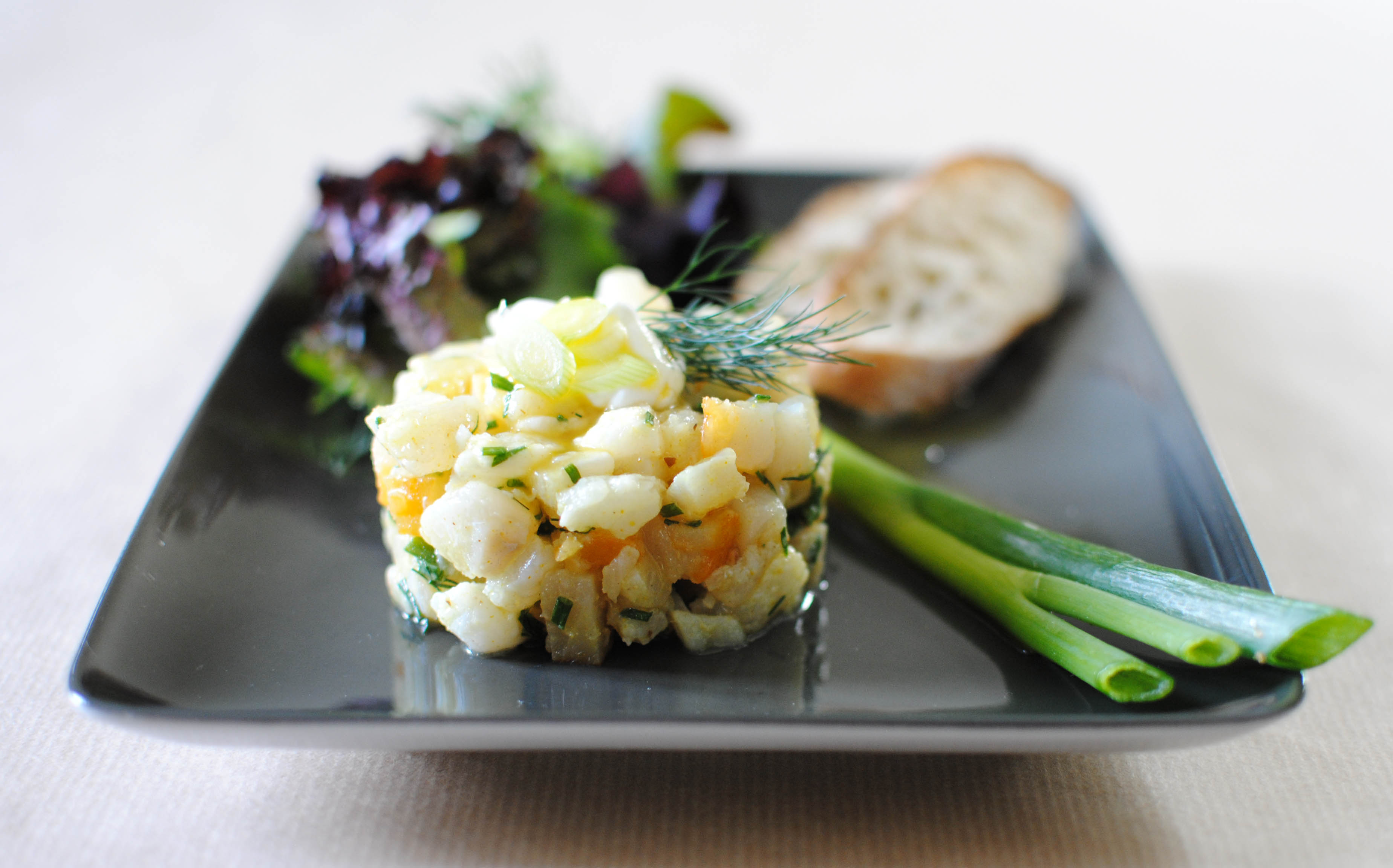 Ajoutez la ciboulette ciselée, l’aneth hachée, le jus du citron, le curry et le gingembre, puis un peu d’huile d’olive. Salez et poivrez.