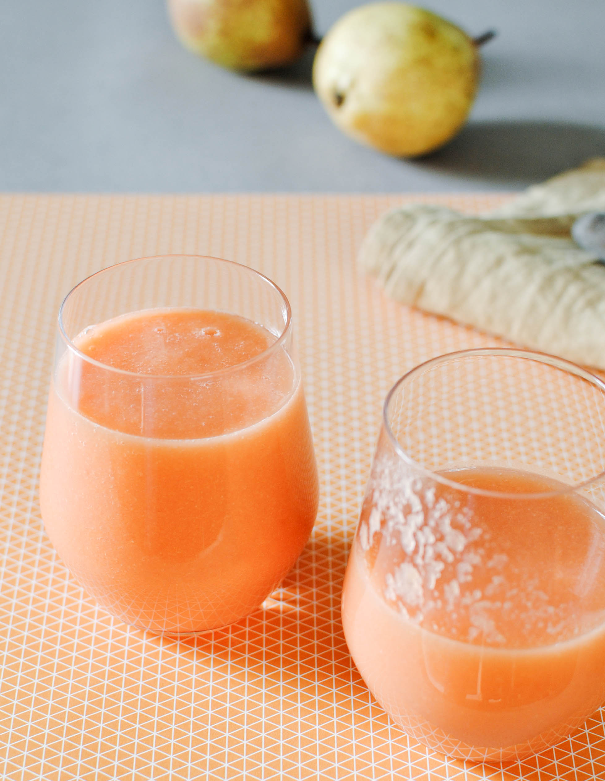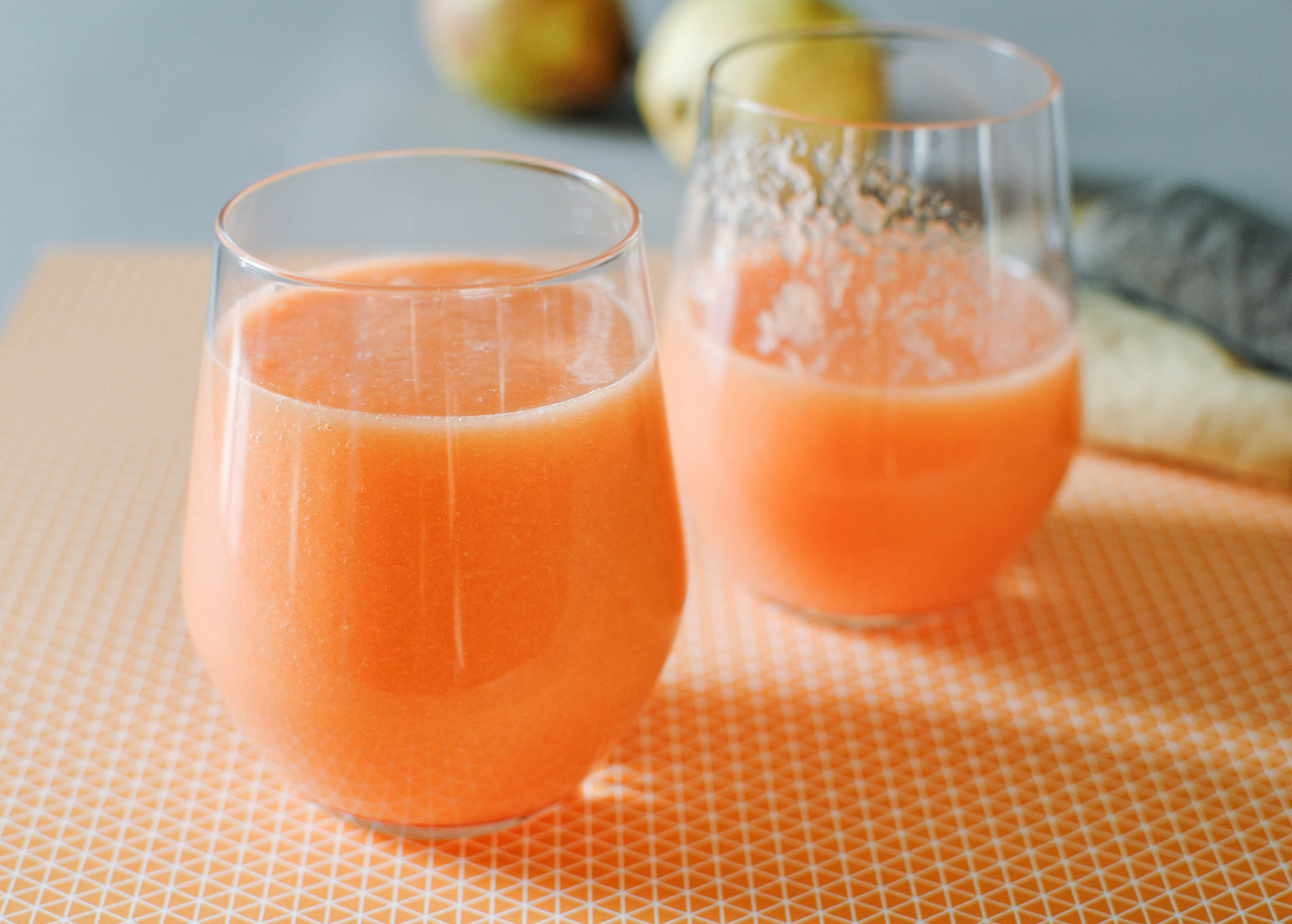 Épluchez la patate douce, le pamplemousse et les poires, coupez les en morceaux et passez les à la centrifugeuse !