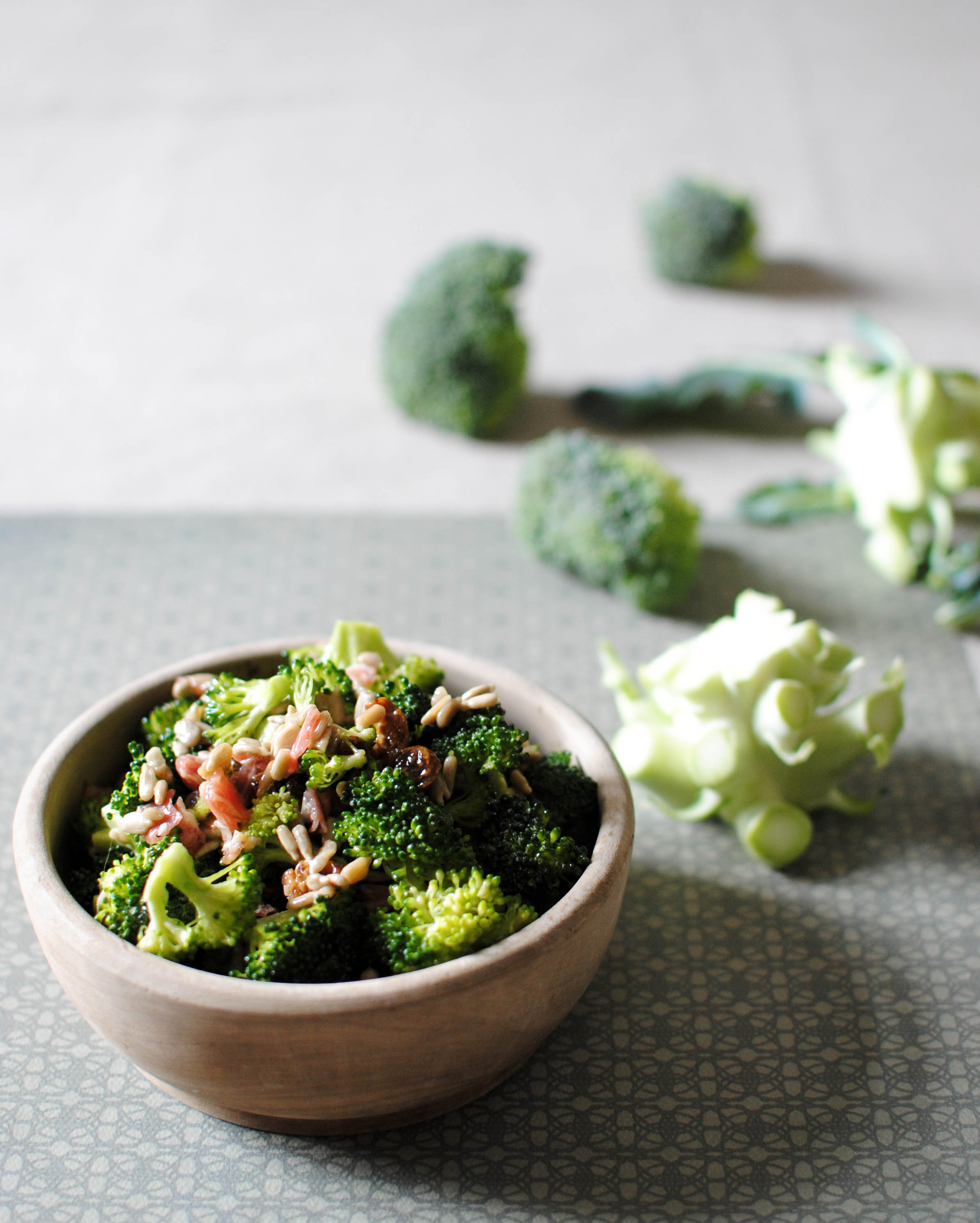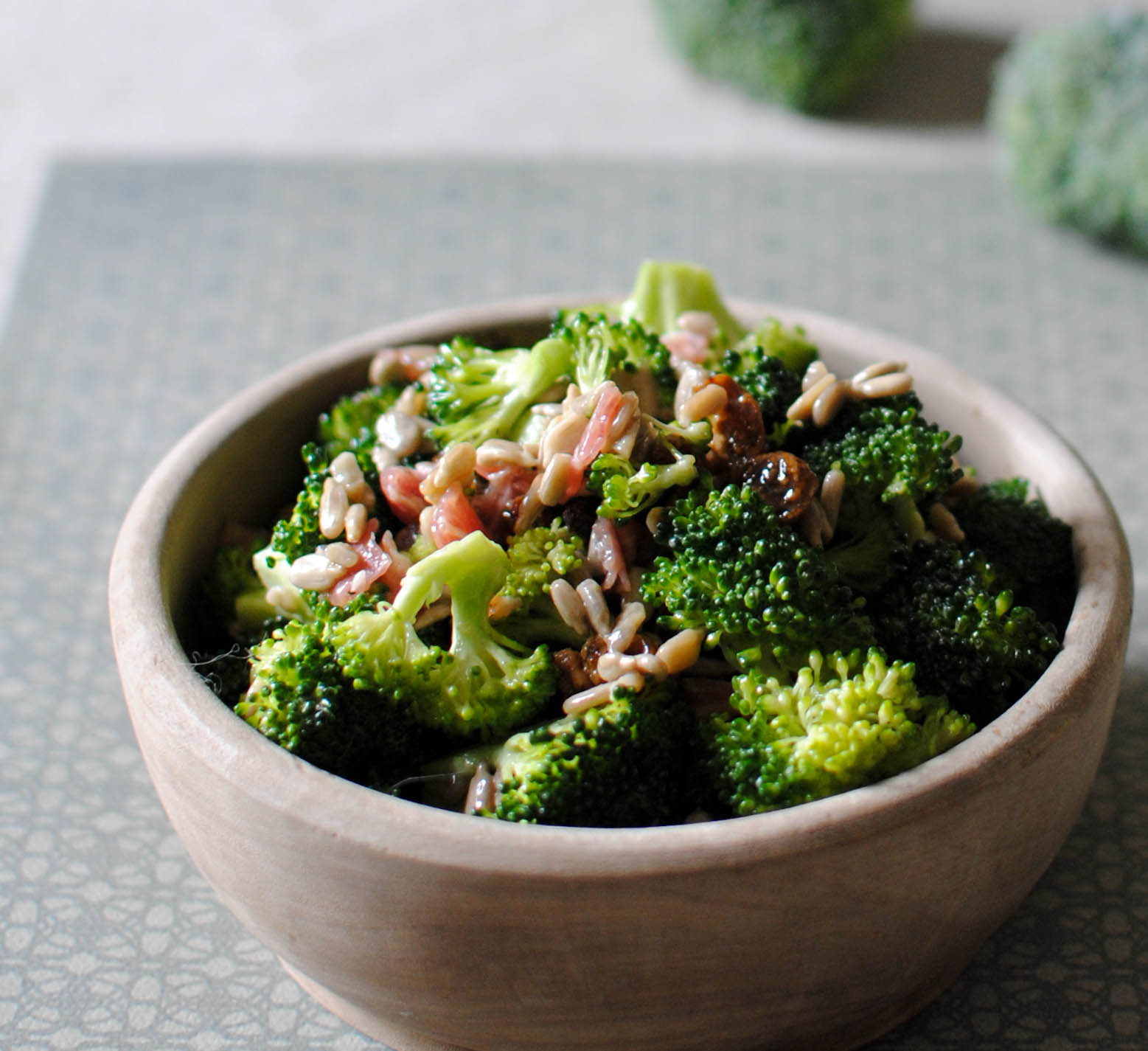 Mélangez le brocoli, le bacon, les graines de tournesol et les raisins secs avec la mayonnaise. Laissez « macérer » ½ journée dans le réfrigérateur avant de servir, le brocoli sera un peu attendri mais toujours croquant !