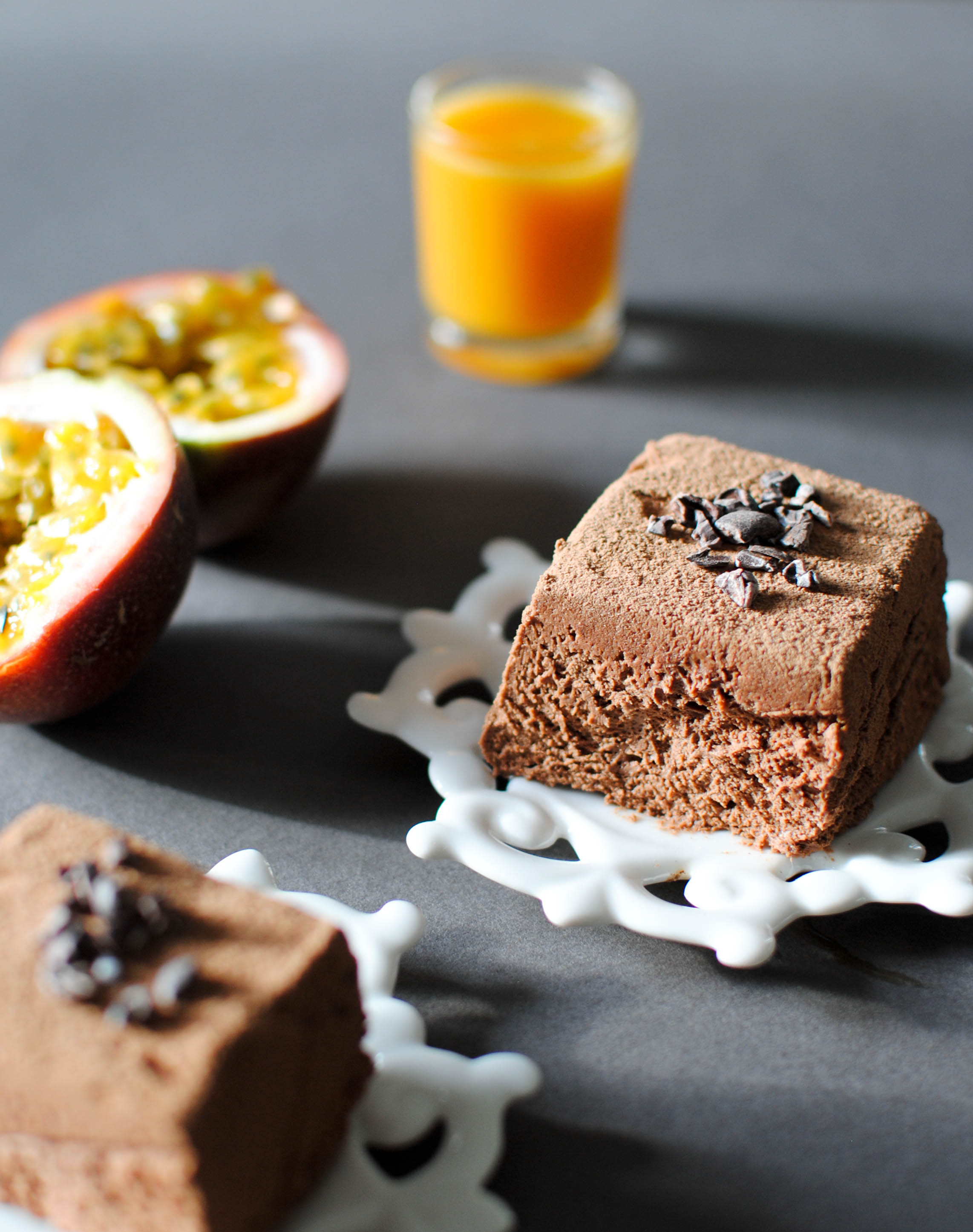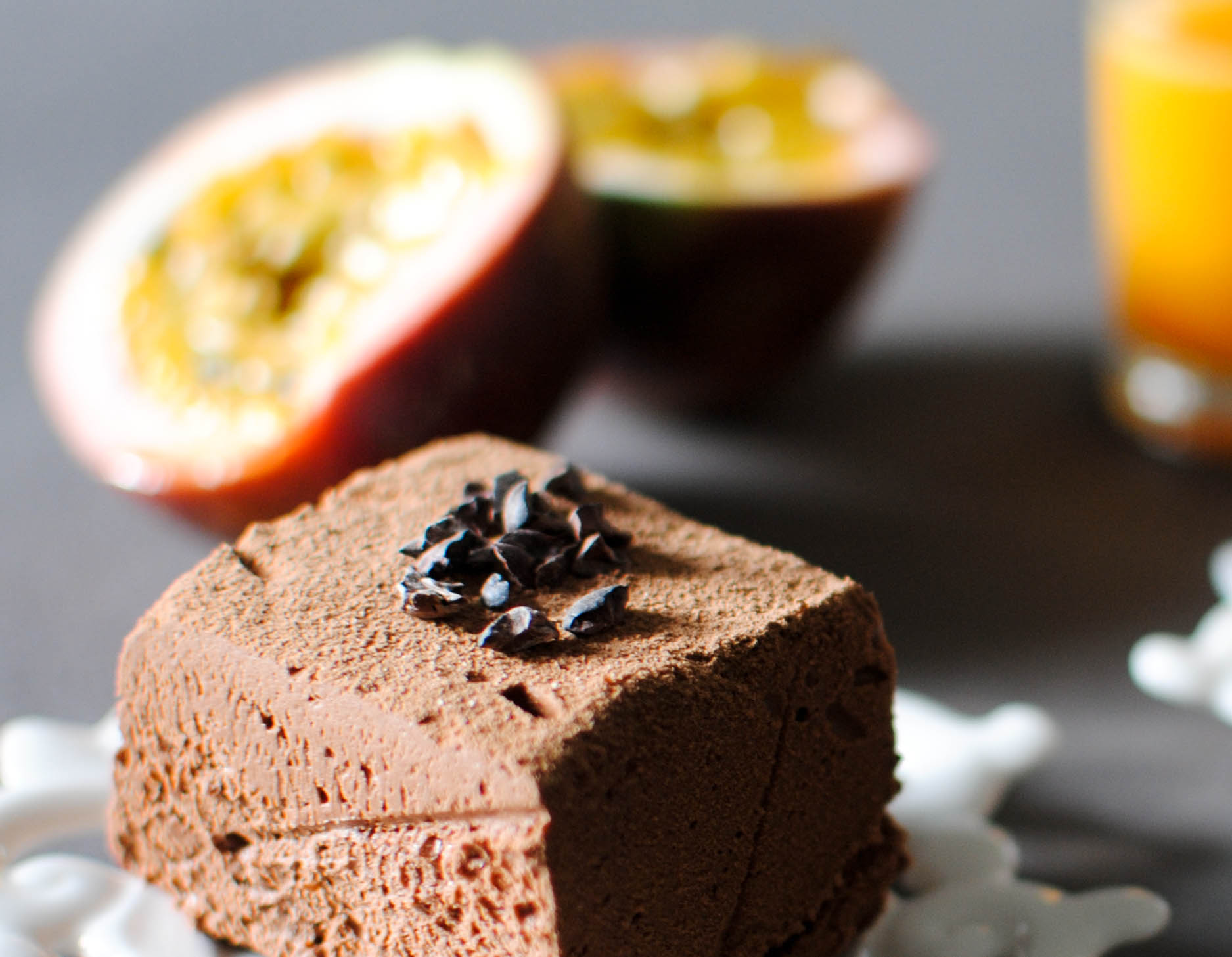 MAIS: il s’agit tout de même d’une marquise au chocolat ! 1ère fois que je m’y colle, j’ai dû m’y prendre à 2 fois (le pourquoi à la fin de la recette), ça vaut le coup, c’est hyper bon, consistance très agréable en bouche ! J’ai juste récupéré le jus du fruit de la passion pour accompagner ce dessert “cliché” et avoir une touche de légèreté à la fin de ce menu spécial Saint Valentin !!!
