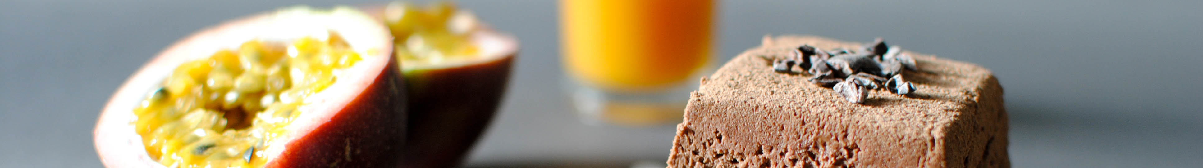 Tapissez 1 ou 2 petits moules de film «étirable » et répartissez la préparation. Placez 12 h au frigo, démoulez et saupoudrez de cacao en poudre. Servez avec le simple jus des fruits (passé au chinois), des copeaux de chocolat ou des morceaux de fèves de cacao cru et MIAM !